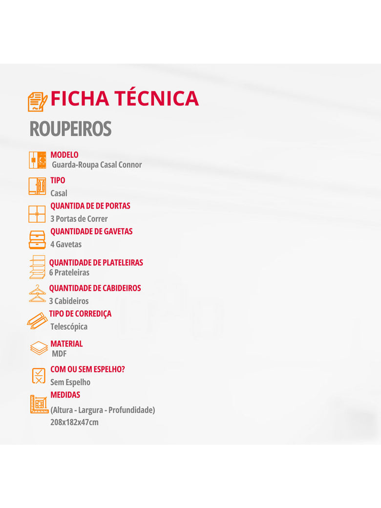 Guarda Roupa Casal Connor 100 MDF 3 Portas 4 Gavetas e 6 Prateleiras Moderna Mobília