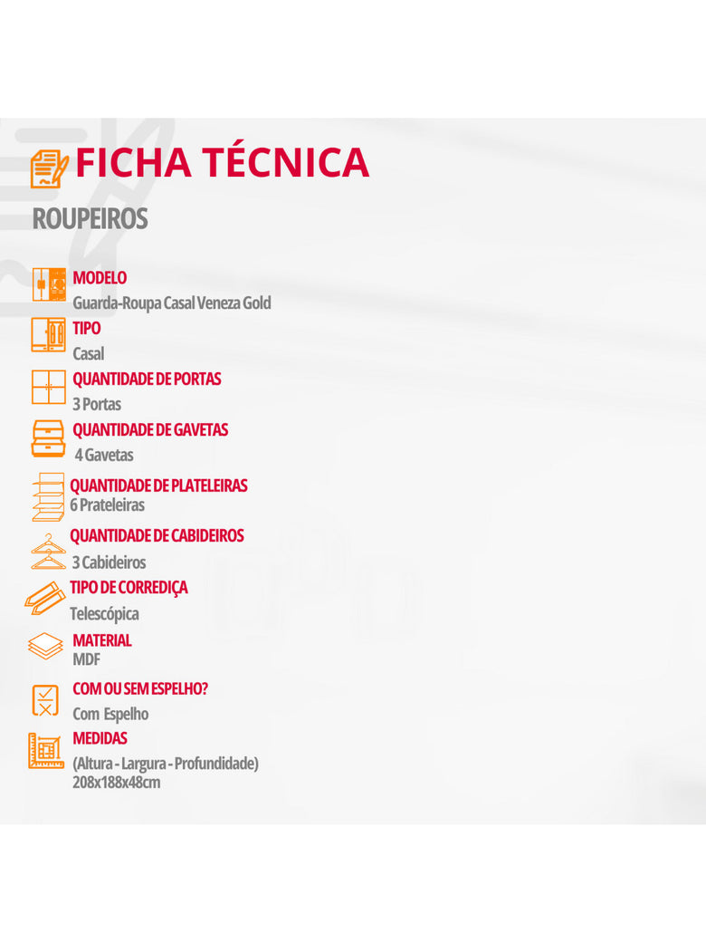 Guarda Roupa Casal Veneza Gold 3 Portas 4 Gavetas MDF e Espelho Rufato